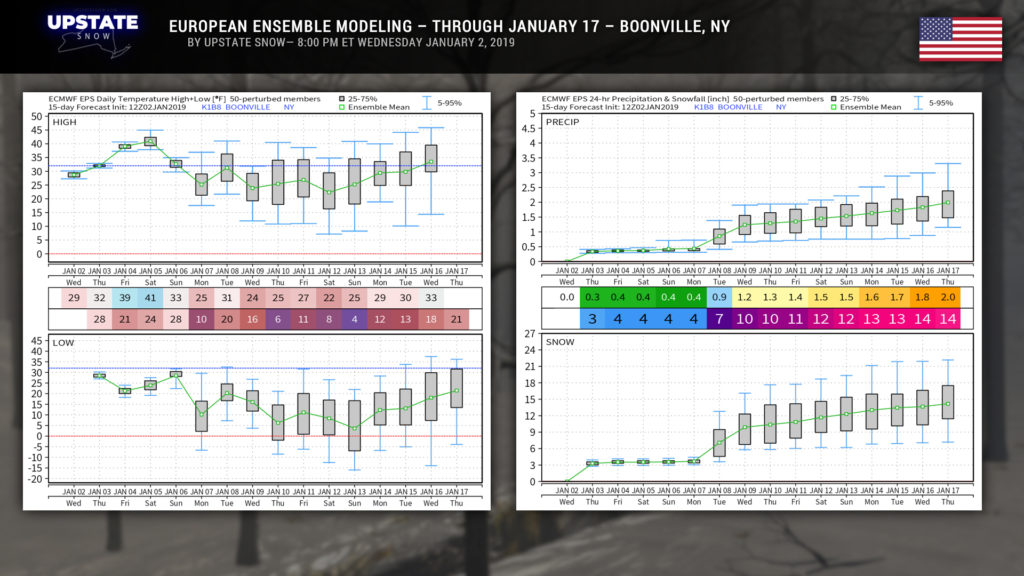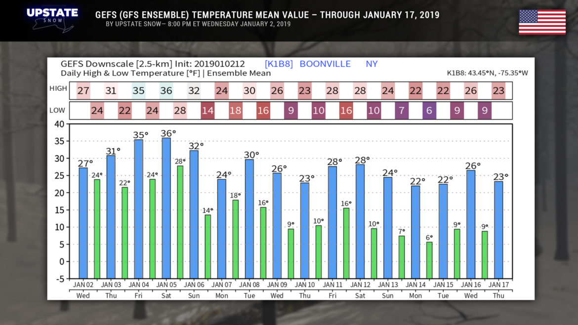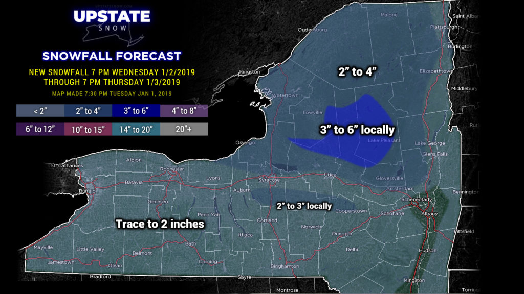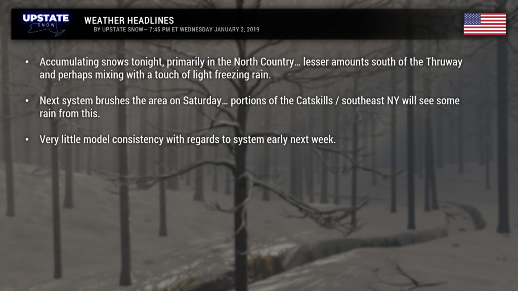 We finally have some accumulating snow to talk about… though it’s not much… but hey it’s something. A clipper system will zip across southern Canada or along the International Border and bring snows mainly north of Route 20, particularly north of the Thruway. Amounts won’t be a lot… but we are painting in some 3- to 6-inch amounts primarily for higher elevations of northern Herkimer and Hamilton counties. This is based on a blend of all the modeling for these areas. South of 20 snow amounts will drop off significantly as there just won’t be much available moisture, and a brief push of “just warm enough” air may cause some very light freezing rain to occur (no precip-type worries over the North Country, plenty of cold air in place for a change).