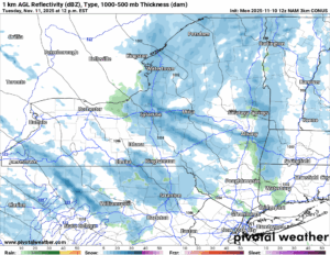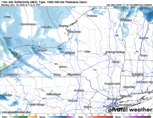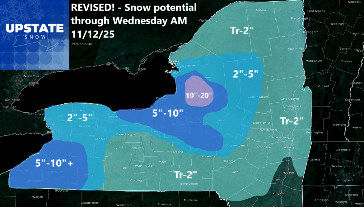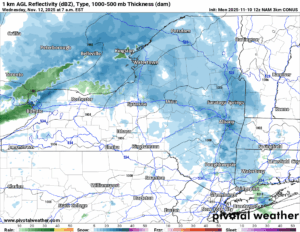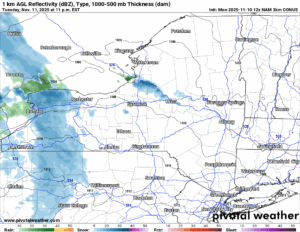 Here is my latest projection with the higher amounts in the northern suburbs of Buffalo, north of the Thruway through the Rochester area, and especially between Rochester and Montgomery County between Utica and Albany. Even in Eastern NY in the Capital Region, I have just enough painted in. Could very well be a trace, however, it would not surprise me if Albany got its first inch on Veteran’s Day. Or Wednesday before changing to rain later in the afternoon and evening.