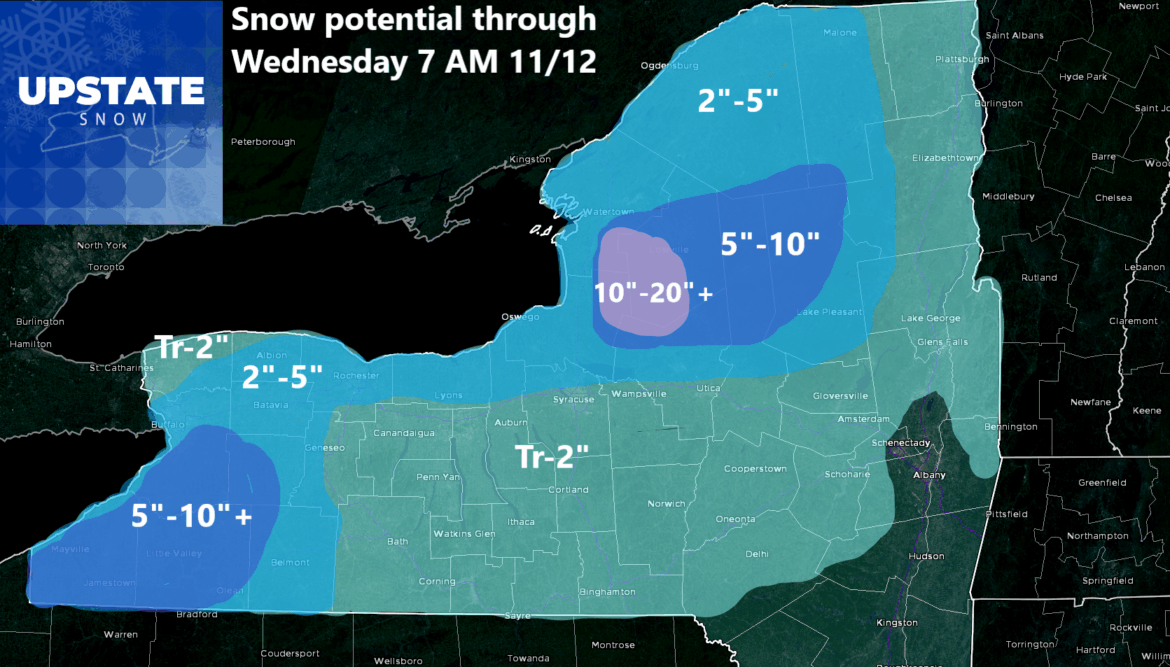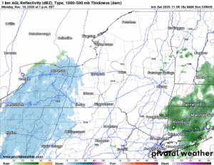 We have predicted this first true blast of “winter” for most of Upstate NY for several days now. We have waited, some would argue longer than we needed to, but we now feel comfortable with the forecast. Basically the closer you are to the Canadian Border, the better chance you will see accumulating snows tomorrow and tomorrow night. The farther away you get, especially towards the Tug Hill and the Adirondacks it becomes a Monday PM to Tuesday PM deal. It warms just enough by Wednesday to make this mainly a higher elevation event.