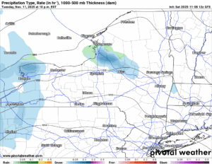 Snow develops mainly near the Canadian Border from along Lake Erie, through the Buffalo area, to Watertown and Massena. Stretch much farther to the east and it’s just rain. At least for now with the warm southerly winds out ahead of it pushing temperatures well into the 40s with lower elevation locations breaking 50 for a limited time only!