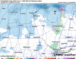 The temperatures take one last swing upward, in this case even the higher elevations get hit with changeover to rain or a mix for a time, with the lower elevations getting into the 40-45 degree range. The 995 mb low passes to our north and west over the St. Lawrence Valley then the colder air follows it in time to change this to all snow by Thursday. Again, in this situation, it’s best to handle the snow map on a one day basis. This would be too far at the moment.