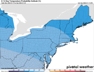 Looking into MLK Weekend for next weekend, through all of the next week, then into two weekends from now with the AFC/NFC Championship Games, the temperatures are clearly showing up as BELOW NORMAL all across not just Upstate NY but the entire Northeast US. This is the coldest two weeks of the entire year. Right now. Our highs are in the 20s to around 30 during the day, single digits and teens at night. Being below that, you can guarantee we will be in a position to increase our snow pack on land, our ice pack on the lakes, and overall just nice winter conditons.