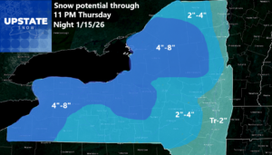 This will be the shortest morning blog of the year. Possibly of the entire time Upstate Snow has been on in over 13 years. Here is the deal: Rain changes to snow tonight. Snow will be heaviest overnight and during the morning tomorrow. It tapers off tomorrow afternoon and is fine by tomorrow night. Areas closer to the lakes will have more moisture flow and therefore heavier snows. While I don’t expect many to hit double digits, it is definitely enough for Winter Weather Advisories. It will be enough to shovel and snow plow in many areas.