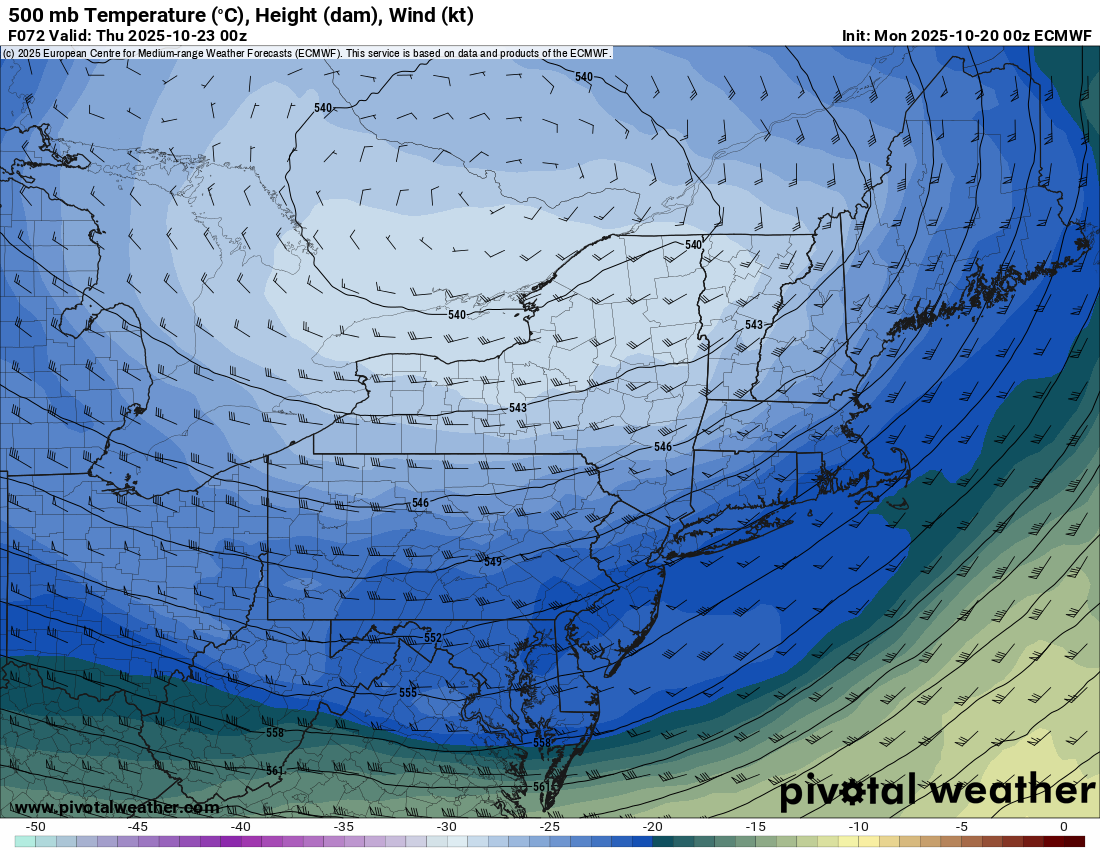 Make no mistake about it. This storm is likely to develop in the next 7 days, and in days 7-10, turn into a large cutoff storm over the Great Lakes. Where exactly it does this will have a huge impact on our weather. Again, as mentioned above, a surge of warmth would be likely out ahead of this thing, but lets say it moves father east than predicted. If we can get that over Upstate NY, it would mean a total change of plans! That’s exactly what it shows for Halloween 2025.