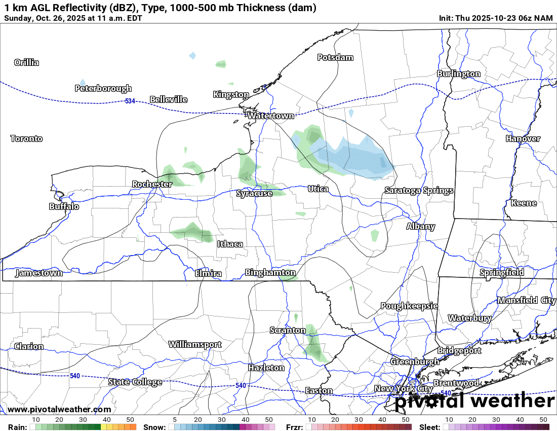 The rain showers have been around Upstate NY for the better part of 24 hours now as of this writing (830 AM Thursday 10/23). It is still way too warm to talk about snow, even in the higher elevations of the Adirondacks. Unless you are talking “high peaks” territory. But things will change as we head through the next 24-72 hours from now. Standby!