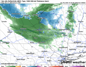 Now that I have all of this out of the way, let me get to what is happening. Rain. There is rain everywhere as of now. It will stay everywhere around Upstate NY this afternoon, tonight and into Halloween. During the afternoon on Halloween, you notice the snow coming down from Canada as the upper level cold pool with the storm approaches. It reaches Upstate NY around sunset on Halloween, then hits most of Upstate NY, along and north of the Thruway on Halloween Night and into Saturday morning the 1st of November. During Saturday morning, the snowfall tapers off, especially in the higher elevations. By Saturday afternoon and evening it should be just mostly cloudy and cold.