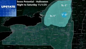 Welcome back! And welcome to the FIRST 2025-26 SNOWFALL MAP! It is not much, but at least it is something! We have the best shot at our first snows of the season on Halloween Night and into Saturday morning the 1st of November. Hmmm. I remember another much bigger storm at that exact time period. It was in the 1993-94 winter. It just missed setting an amazing unbeatable snowfall record for October because it dropped 3 inches by midnight. As the calendar flipped to November, another 11 inches fell, bringing the SNOWVEMBER total to 14 inches on the afternoon of November 1st.