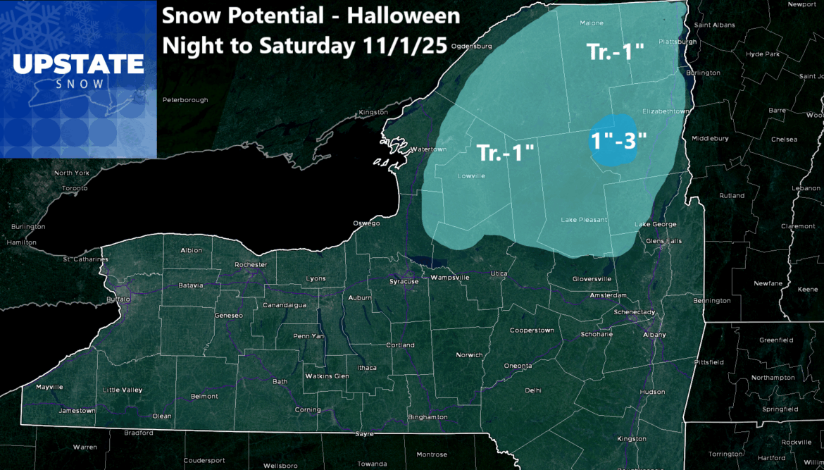 But with the snowfall above the ground, and temperatures below freezing, it means the first opportunity for the snow to actually STICK! It is mainly a higher elevation thing, it will not hit the lower elevation cities. However, places like Old Forge, Lake Placid, Tupper Lake and Malone could very easily see at least a dusting to 1″ of accumulation. Only in the high peaks (above 2500″) would I expect INCHES of snow. Even here I believe it will be localized.