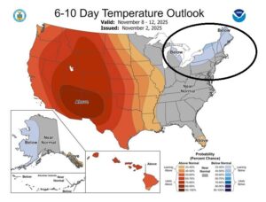 It is looking BELOW NORMAL in both the 6-10 day and the 8-14 day outlooks. With highs generally in the 40s and lows in the 20s at this time of year, it doesn’t mean below freezing weather 24/7. Yet. However, we are into the time of year to whenever ANYTHING is below normal between now and March, you can mention SNOW with authority and more often than not you will be correct! Not 100% of the time, but WAY more than you will with it ABOVE NORMAL. So with the STORM 4 which is really the 11/10 storm, one week from today, that looks to have some staying power and a good setup for lake effect snow behind it. This could easily with normal temperatures falling and snow starting to hit not just the highest elevations anymore, to where, we start to get some traction on snow! Hang on folks! It’s going to be interesting!