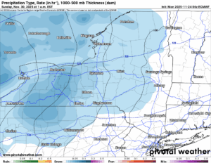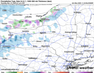 During the day on Thanksgiving we will have snow showers with locally heavy lake effect squalls. Given the fact that the Great Lakes are still above normal on temperature (though not as bad as last year since this has been a colder than normal month in terms of temperature as opposed to last year), we are not surprised. Still however, we are expecting in the most intense bands of snow at least 1″ per hour of accumulation.