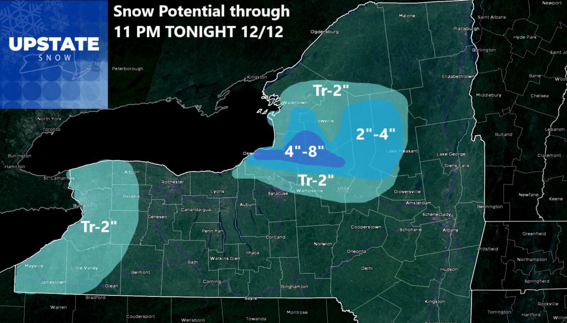 We have more lake effect snow, best chance of which will fall across Oswego and Northern Oneida Counties. It may extend further north and east, but this is our area of focus for now. Locally several inches of additional snow is possible.