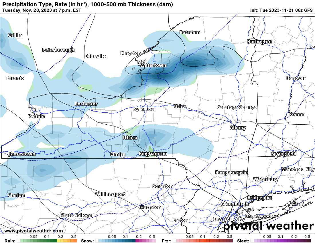 The Lake Effect Snows, at least based on this model run, could be the first decent dump of the season. And right on schedule. It shows Lake Effect starting Monday then getting heavier on Tuesday. Here is the Tuesday PM map showing lots of LE Snow blowing off both Lake Erie and Lake Ontario. These bands of snow diminish in time for Wednesday 11/29.