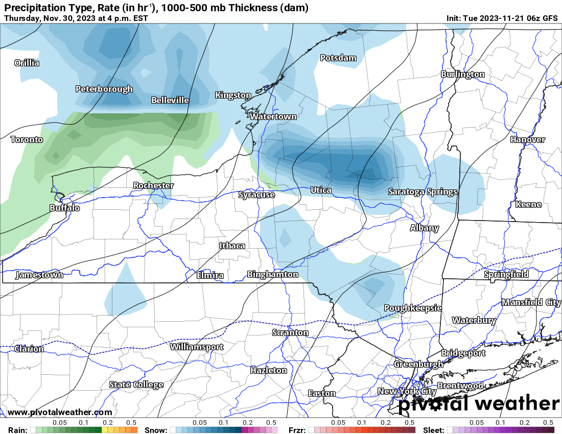 Then heading into Thursday 11/30, we get another cold front followed by more Lake Effect snow. Another band of Lake Effect, especially off Lake Ontario, comes roaring into areas along and especially north of the Mohawk Valley with locally another several inches possible. Now understand the difference between possible, likely and imminent. Possible means maybe or maybe not. Likely means more likely than possible but not imminent. Imminent means… well…