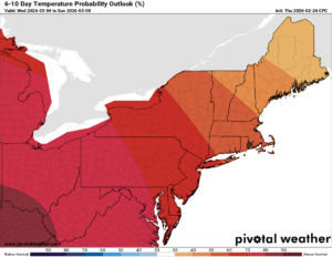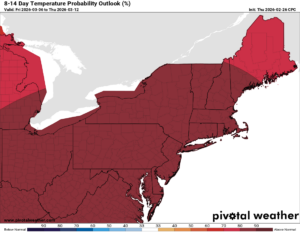 The 80-90% reach of warmth into the entire Northeast from March 4 through March 13 is a tell tale sign that SPRING IS COMING. FAST. Normal temperatures are above freezing everywhere by March, 30s up north, with 40s in the lower elevations. Based upon some of the data I am looking at, several days of 50s and 60s if not 70s, near record highs, are very possible during this period. Stay tuned. The snow will melt fast. Waters will rise fast. Floods will come fast. Just be prepared for it.